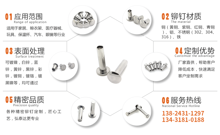 • 可定制直徑0.6mm~10mm;長度3-150mm的各種尺寸鉚釘